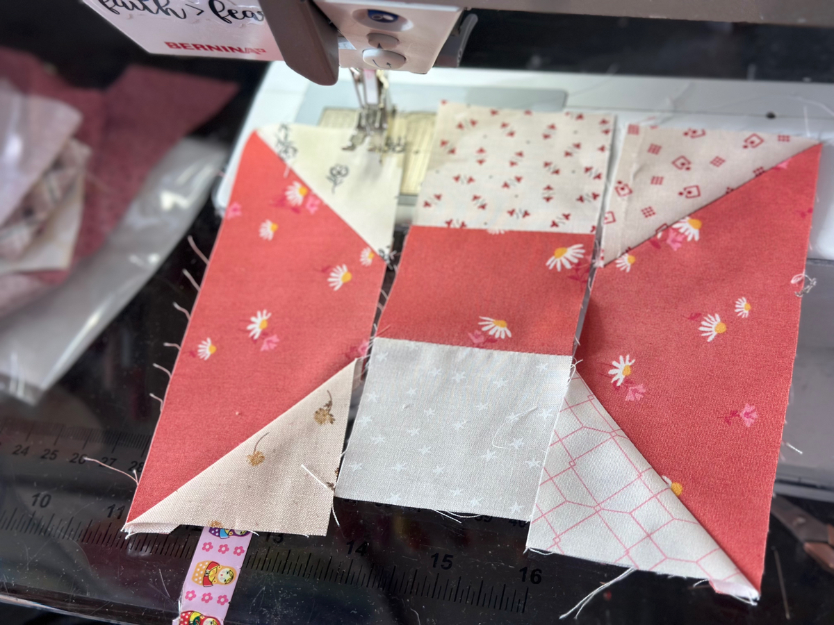 I may be the only one, but I have saved ALLLLLL of the little triangle off cuts from my Sonnet quilts. And lots of other quilts as well. I have so so many triangle fabric scraps that need a quilty project. And since my business is kits and this is a project truly designed for scraps, I am offering the pattern for free. I’ve long loved spool and butterfly blocks and these are just too cute to keep to myself. I’ve written up the tutorial for the larger 12″ blocks as well as the smaller 6″ blocks made with the off cuts.